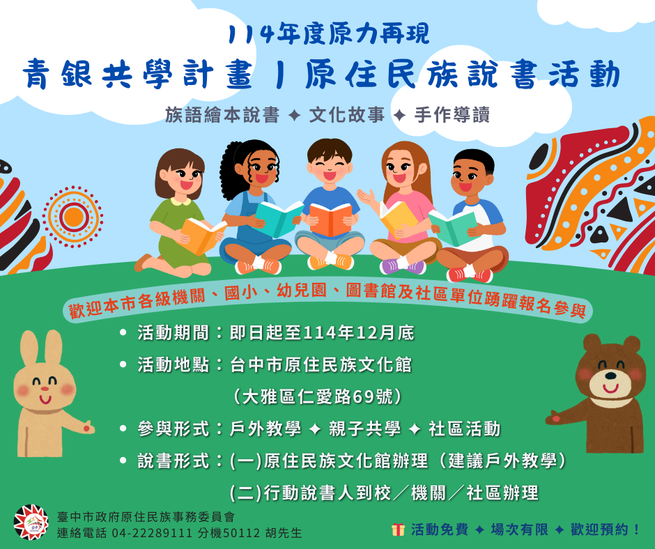 【活動宣傳】臺中市政府原住民族事務委員會辦理「114年度原力再現–青銀共學計畫」說書活動