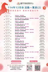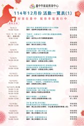 臺中市家庭教育中心114年12月份活動一覽表-1 為促進本市家庭教育推展,以達成家庭教育法所定目標, 臺中市家庭教育中心於114年12月舉辦一系列活動,請民眾踴躍報名參加,詳細資訊亦可至該中心臉書粉絲頁查詢(網址:https://reurl.cc/XaE9NE) 。