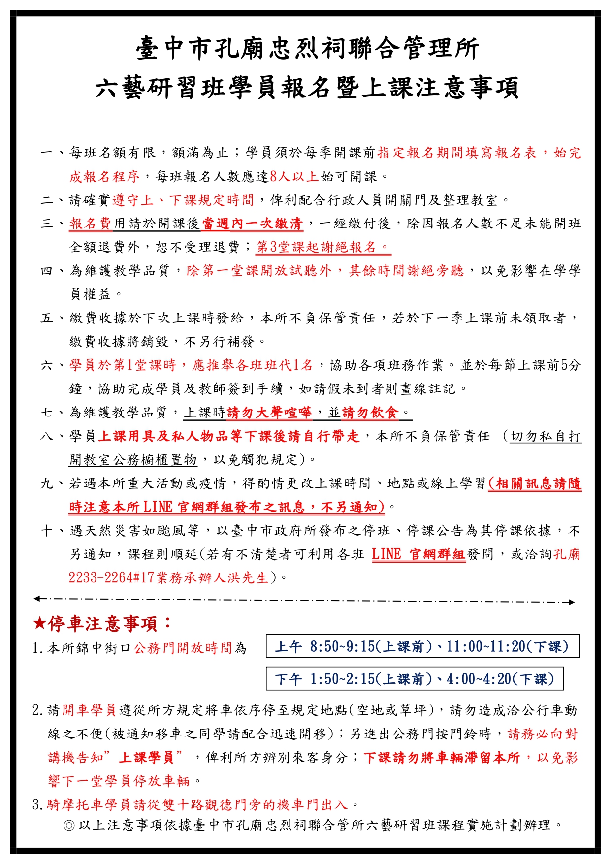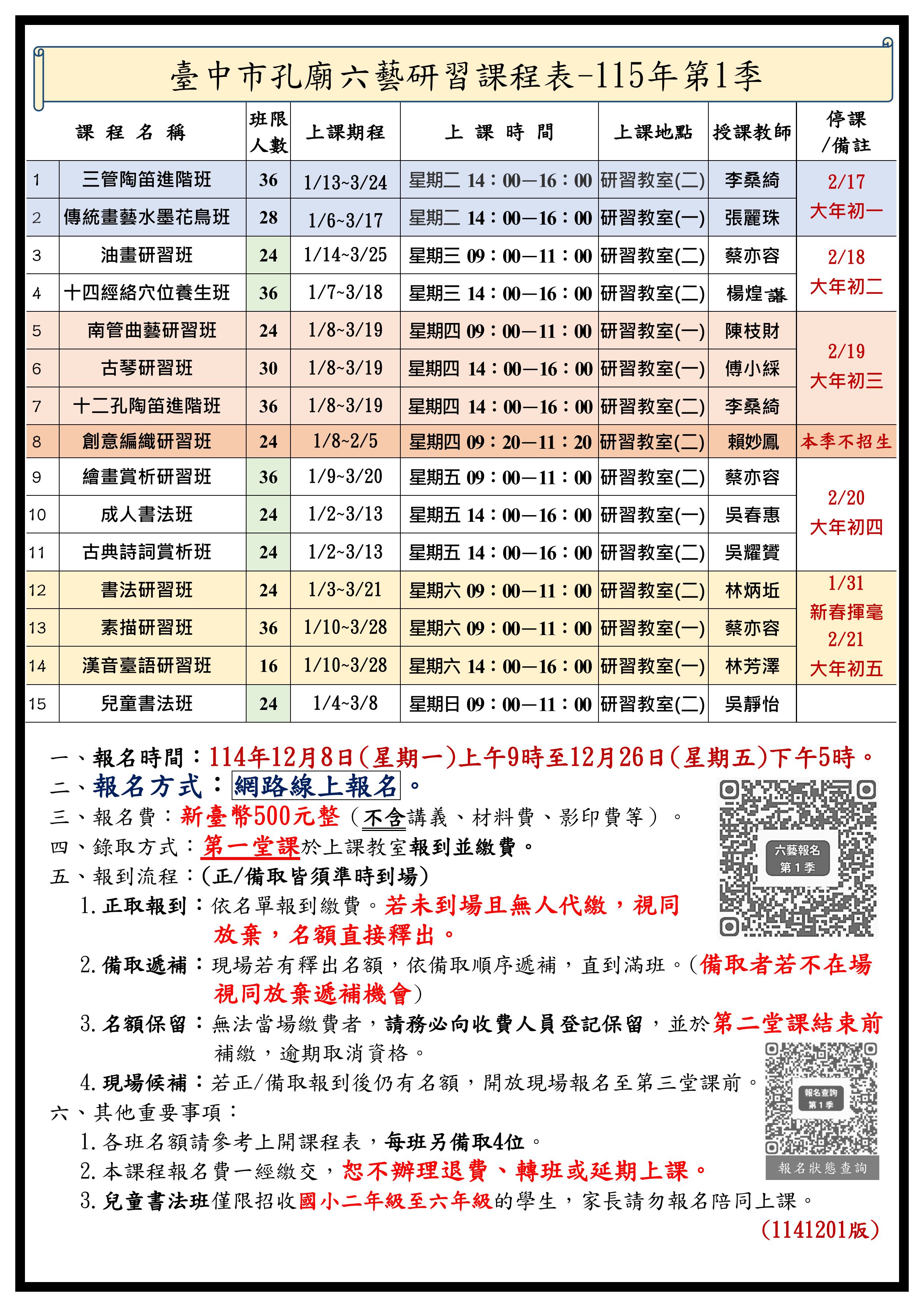 臺中市孔廟六藝研習班115年第1季(1到3月)課程報名日期公告訊息宣導