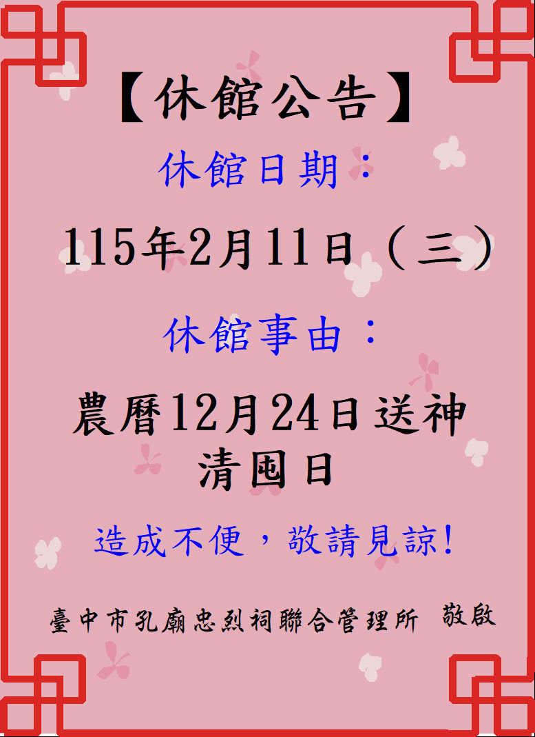為農曆12月24日送神清囤日 於115年2月11日(三)對外休館
