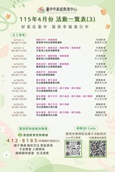 為促進本市家庭教育推展,以達成家庭教育法所定目標, 臺中市家庭教育中心於115年4月舉辦一系列活動,請民眾踴躍報名參加,詳細資訊亦可至該中心臉書粉絲頁查詢(網址:https://reurl.cc/EmpAX1 ) 。
